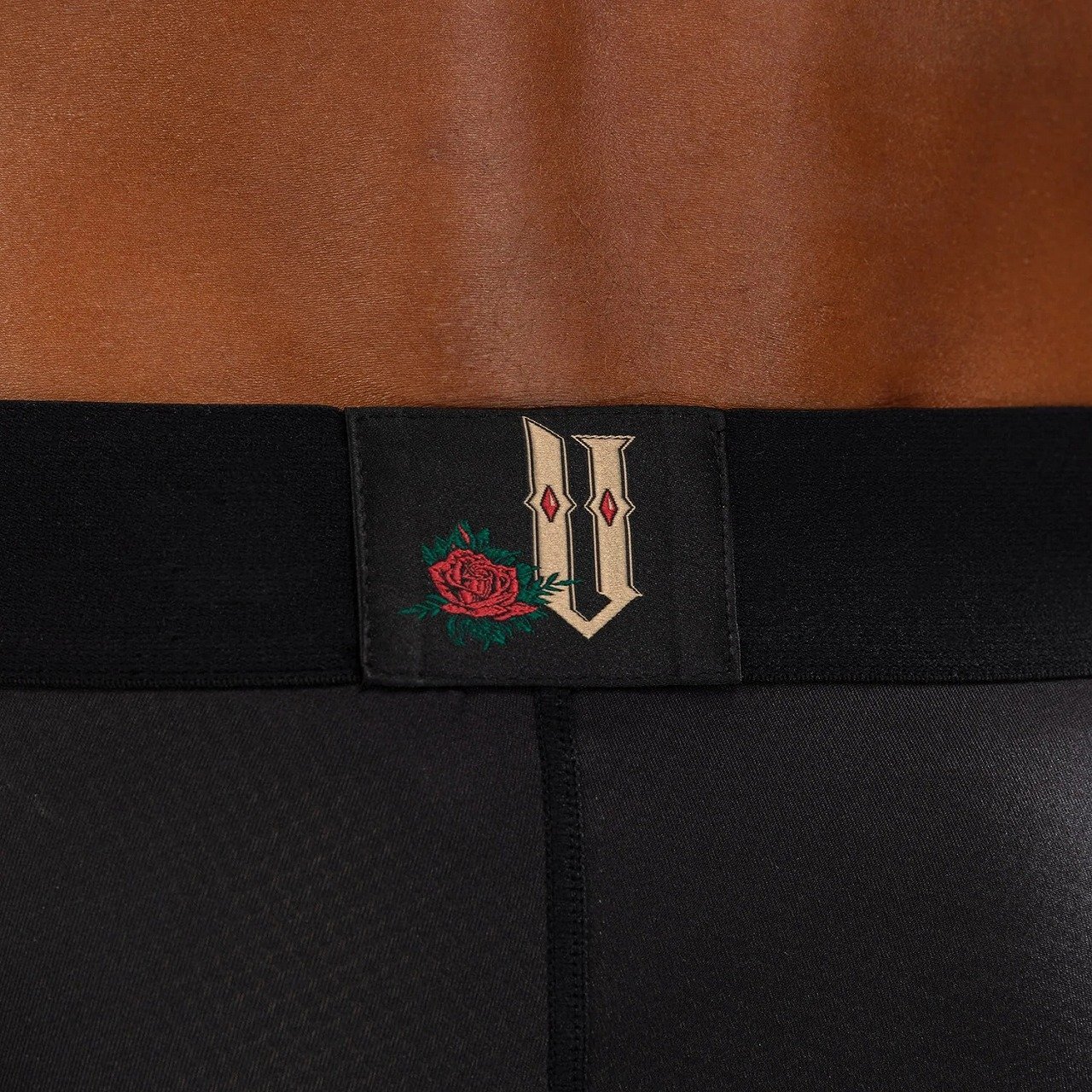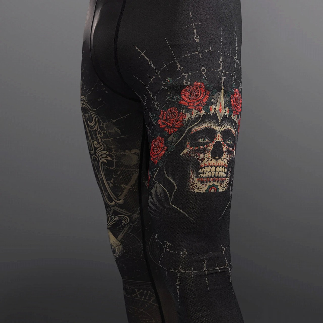 このスパッツは、印象的なブラックとゴールドのデザインに、サンタ・ムエルテ(死の聖女)に捧げられたゴシック調のグラフィックが施されています。
